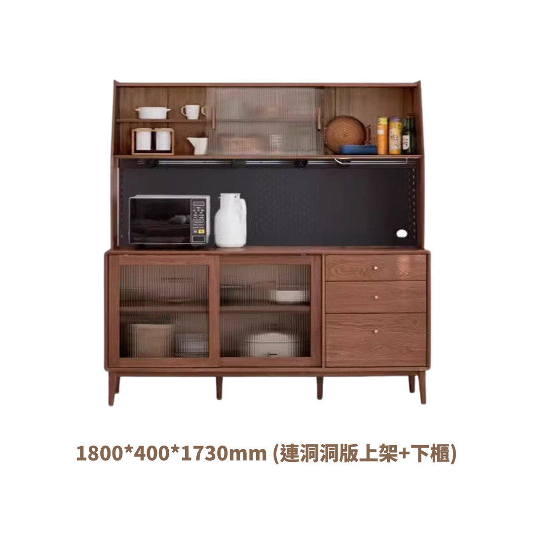 下方配置了特深置物空間,能容納大型湯鍋、電飯煲或囤積的乾糧。右側的多層實木櫃桶則適合分類收納餐具、餐墊等零碎小物,讓收納井井有條,取用時一目了然。